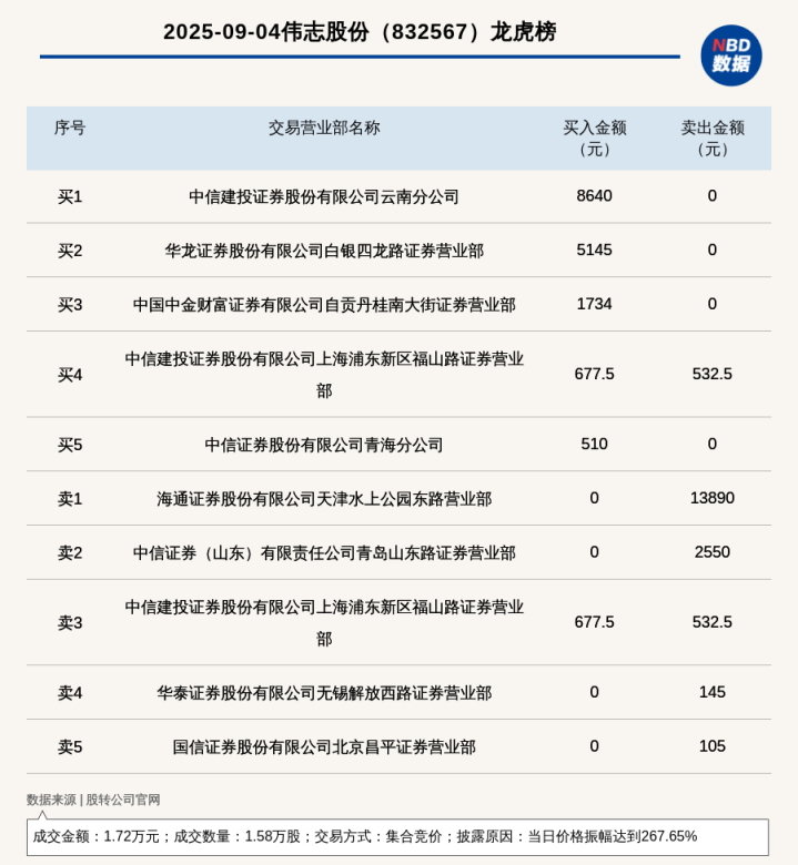 每经讯,2025年9月4日,新三板创新层公司伟志股份(832567,收盘价:1.45元)登上龙虎榜,交易方式是集合竞价大额股票配资,披露原因是当日价格振幅达到267.65%,成交数量1.58万股,成交金额1.72万元。买一席位为中信建投证券股份有限公司云南分公司,买入8640元;卖一席位为海通证券股份有限公司天津水上公园东路营业部,卖出1.39万元。