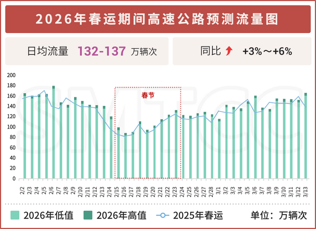 随着探亲流、学生流、务工流、旅游流多重叠加,2026年春运期间出行需求持续增长,高速公路流量呈上升趋势。预计2026年春运期间高速公路日均流量132万~137万辆次,同比增长3%~6%。