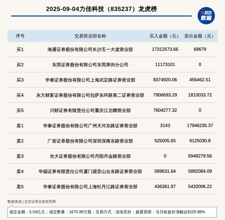 每经讯配资网上配资网,2025年9月4日,北交所上市公司力佳科技(835237,收盘价:32.08元)登上龙虎榜,交易方式是连续竞价,披露原因是当日收盘价涨幅达到29.98%,成交数量1670.99万股,成交金额5.04亿元。买一席位为海通证券股份有限公司长沙五一大道营业部,买入1731.26万元;卖一席位为华泰证券股份有限公司广州天河东路证券营业部,卖出1794.62万元。